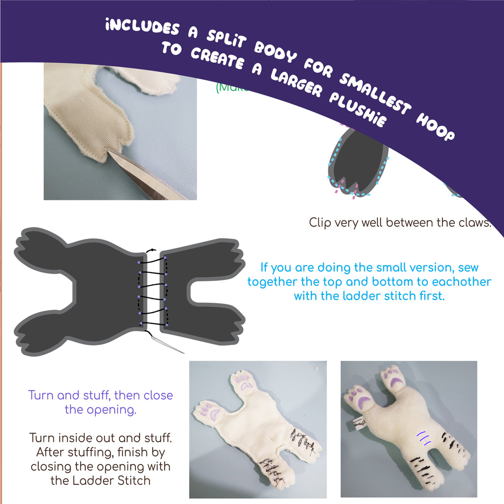 5 Hoopings (7 on split size) = which means you will need 10 pieces of fabric (14 for the split size) for each plush and a little extra for applique.